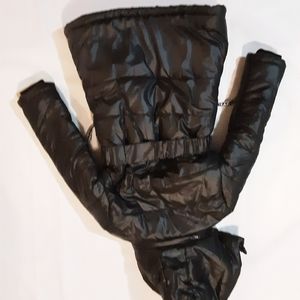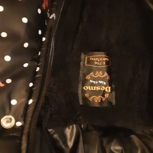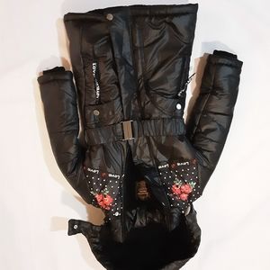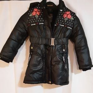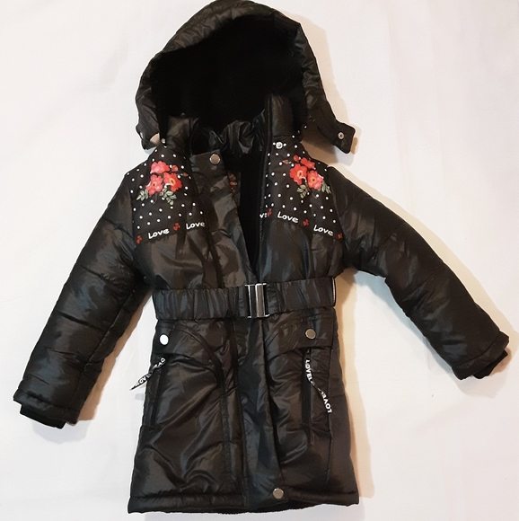 Black jacket with floral design. Hood is detachable