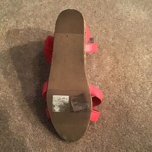 Dressy kids peach color sandals with an adjustable strap and a sparkly gold pattern on the side of the sandals.