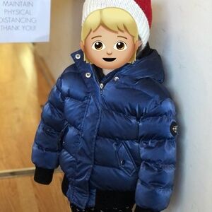 Kids unisex short winter coat. Canadian designed premium outerwear. Warmth and style, vegan/cruelty-free (this is the shiny one from a few seasons ago, they have new designs every season and discontinue the previous seasons coats. The current closest one is blue sapphire which is more sparkly but this one is an overall blue shiny finish).