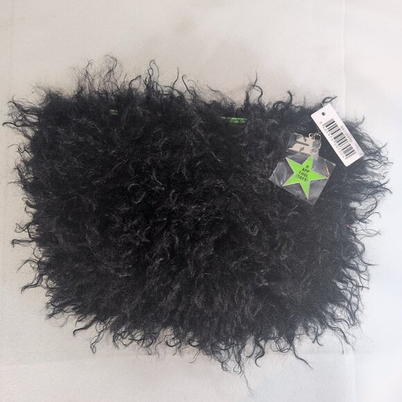 Faux fur, fuzzy fluffy curly black Y2K style with a green Happy Holidays star as a zipper pull.