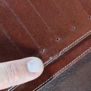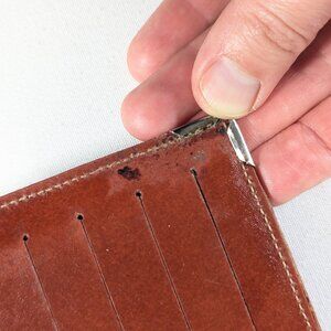 Overall in good condition, apart from the top inside corner where there is some staining and scratching to the leather (see pictures) and some wear to the leather edges on the outside. The fabric behind the ID slot is loose