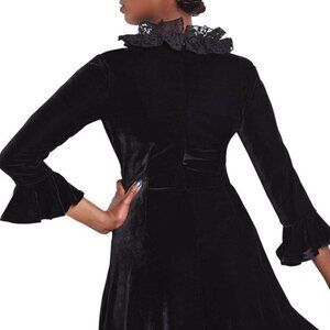 Elegant black mini dress. Features ruffle details. Perfect for any occasion.