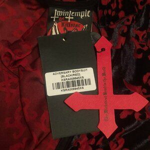 .⋆♱⋆⁺₊rare limited edition KILLSTAR X TWIN TEMPLE ADVERSARY black red burnout velvet low open back flare sleeve bodycon pentagram cross goth gothic vampire Victorian band merch bodysuit