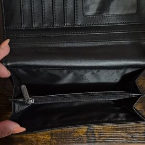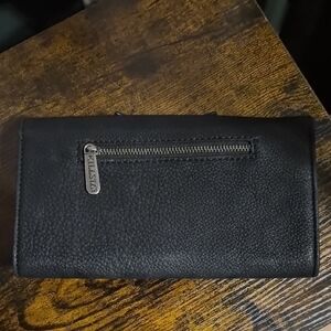 Edgy black large wallet by Killstar. Features crisscross strap design with metal ring and studs.