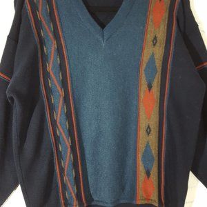 Kilspindie of Scotland VTG Navy Wool Blend Geometric Knit V-Neck Sweater