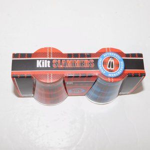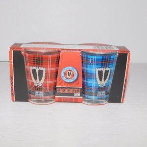 This super fun KILT SLAMMERS Twin Pack Blue Red Tartan Plaid Kilt 2 Shot Glass Set is NEW in Package. Glasses measure 2.5" tall.