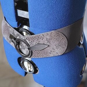 An elasticated waist belt by Kim & Co in a mock snake print and gunmetal finish.