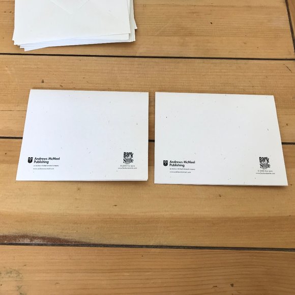 Bark & Smile Pet Portraits by Kim Levin Collection boxed notecard set is partly used; set contains 7 unused cards & envelopes. Cards are blank inside, 4"x5". The shih-tzu cards are missing; you will receive 3 Springer Spaniel cards and 4 Terrier (?) cards. Includes envelopes.