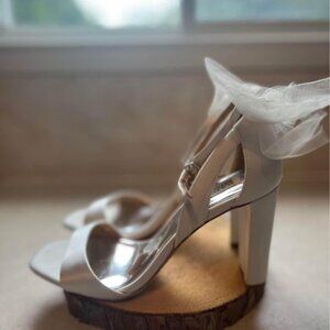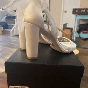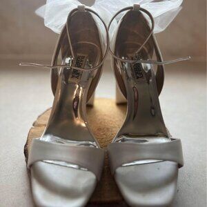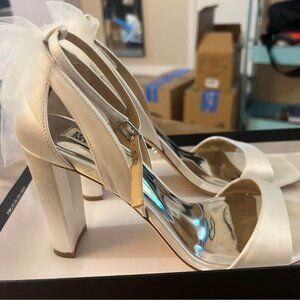 Beautiful block heel shoes from Badgley Mischka. Leather outsole, silk satin uppers and tule bow. Worn twice (bride on wedding day x 2, with pantyhose). Retails for $375 plus tax.