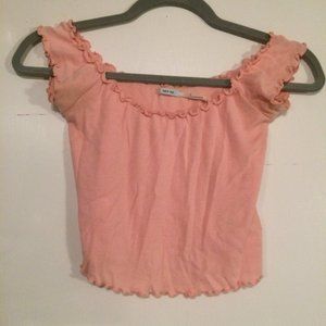 Lettuce edge cropped tee by Kimchi Blue. Made from a super soft knit in a bodycon fit. Topped with an off-the-shoulder neckline with lettuce-edge detailing at the hems. Finished with short sleeves.