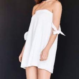 Chic strapless mini sack dress with off-the-shoulder tie-sleeves by forever femme label, Kimchi Blue. In a loose silhouette that tapers with an elastic-back top and scoop-front neck.