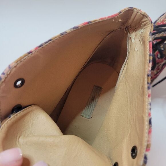 Gorgeous Kimchi Blue soft velvetty flocked fabric wedge heel lace up booties size US8 in EUC only worn once or twice. Pattern style is similar to a vintage embroidery / cross stitch aesthetic. Colors are a dark tan base color decorated in taupe raspberry and dusty rose lined in navy blue.