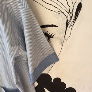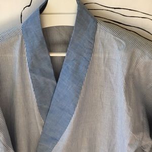 Cotton Japanese style, minimalistic robe, with one pocket and tie closure. Denim blue stripes and piping. This product is brand new, it it has no labels inside or outside. This is a product sample.