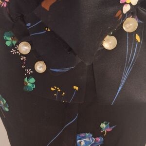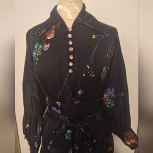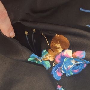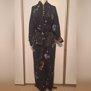 Black flowered kimono style robe with sash, maxi, vintage. PTP approx 32" measured lying flat. Length lying flat from shoulder 53". Sash is 82"