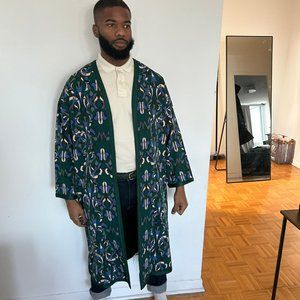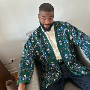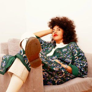 TAFUKT IZZA Discover the TAFUKT jacket, perfect for brightening up your summer outfits! Its 100% African fabric showcases a geometric emerald green print with a touch of mauve. This bold piece invites you to embrace originality, cheerfulness, and elegance. Be ready to captivate all eyes with this unique creation!