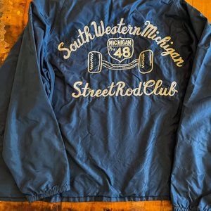 Beautiful condition Men's Vintage Retro King Louie lined Windbreaker Jacket. Embroidered on back for the Southwestern Michigan Street Rod club. Featuring left embroidered script name “Jerry”, snap button closure and elastic cuffs. Nylon shell, Arnell and Nylon lining in excellent condition. Color dark blue. Size Large. Excellent condition. Made in USA.