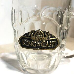This sturdy glass beer mug features a "King of Cash" emblem, designed for a regal drinking experience. Its robust build and classic design make it a practical choice for beer enthusiasts.