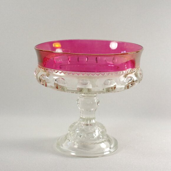 This beautiful clear and ruby red glass pedestaled compote candy dish is King's Crown thumbprint made by Indiana glass in the 1970s. It has crisp deep relief and glows beautifully with sunlight shinning through it. What a fantastic centerpiece!