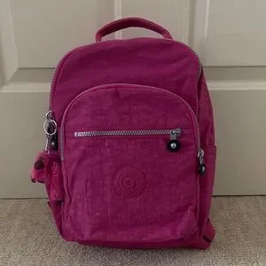 Kipling Bright fuchsia backpack with signature charm. Ideal for daily adventures. Durable and stylish.