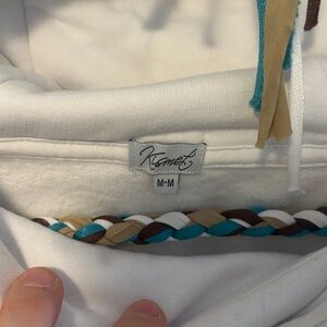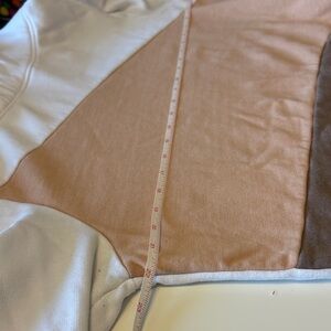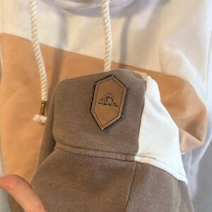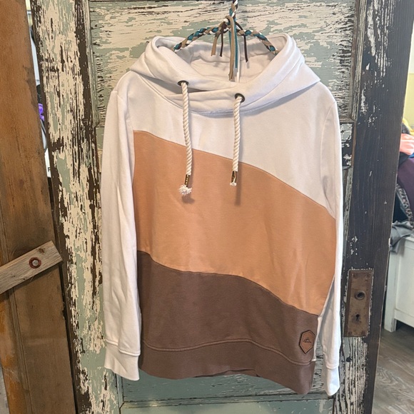 Stylish colorblock hoodie featuring white, tan, and brown sections. Unique rope drawstrings add a trendy touch.