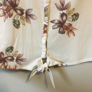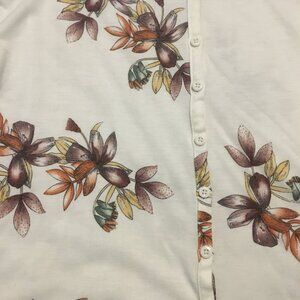 Very good preowned condition, white, button up, tie hem tank top, featuring crochet lace on the back and a bird of paradise floral print beautifully distributed throughout in . muted purples, oranges and greens. Imbue your summer wardrobe with some botanical love.