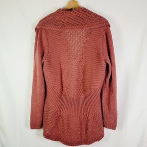 Stay cozy and stylish with this open front knit sweater. Perfect for layering, this cardigan adds warmth and texture to any outfit. Dusty rose / rust tone color. GUC