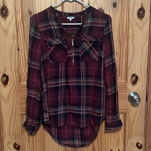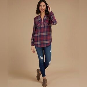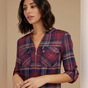 Essential plaid button-down in a soft and lightweight fabrication. Featuring chest pockets, zipper collar detail, and curved hem for a flattering fit, it’s a practical and stylish piece you can wear with your favourite jeans.