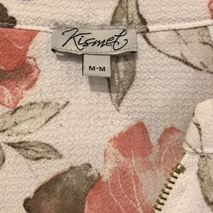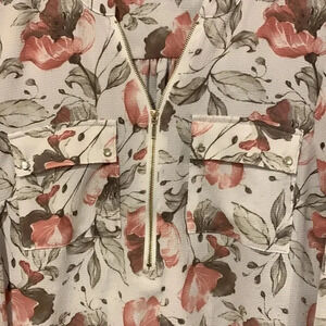 White with pink light brown floral pattern. 2 pockets on chest, gold zipper at neckline and 1/4 way down. Long sleeves that can be rolled up. Pretty! Size Medium. Fabric has stretch.