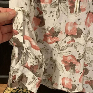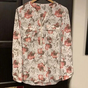 White with pink light brown floral pattern. 2 pockets on chest, gold zipper at neckline and 1/4 way down. Long sleeves that can be rolled up. Pretty! Size Medium. Fabric has stretch.
