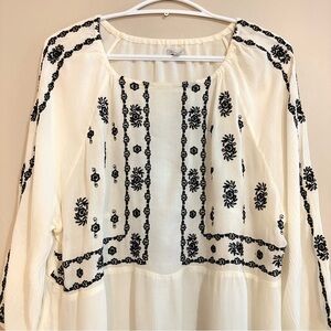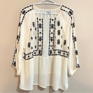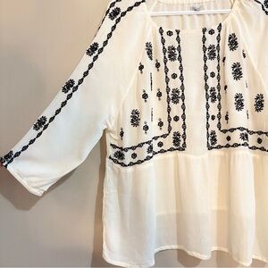 Kismet White Black Embroidered 3/4 Sleeve Blouse Boho Peasant Blouse
