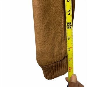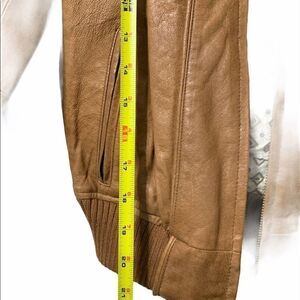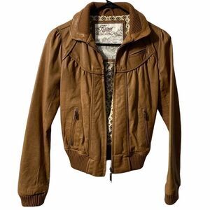 Used in good condition fitted brown leather jacket with two zippered pockets in front and one upper. Super cute and warm has been love some minor started and spots as shown in photos not too noticeable will reflect price