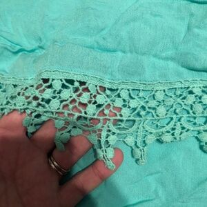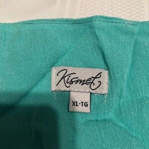 Kismit green camisole like top. Nice lace overlay , spaghetti straps, like new. X-Large Iron is down, so pretty on when ironed. Can be worn with dark or light pants, shorts or skirt. Cruise or beach vacation, this is perfect, green top, white capris, sandals and a hat and you are ready to hit the beach. Uncle up to save more money.
