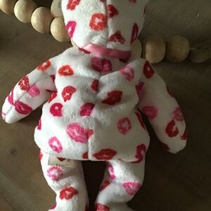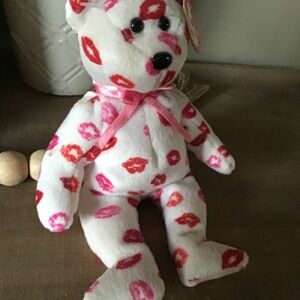 Kissy is a white bear covered in red and pink kisses. She has black button eyes and a larger black nose. She wears a pink ribbon tied around her neck.