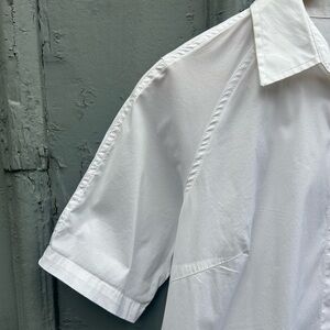 Wonderfully modern take on the short sleeve button down shirt. Pockets slightly askew, side slits.