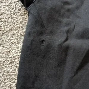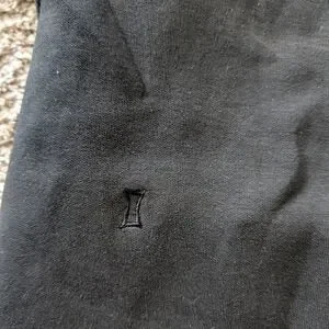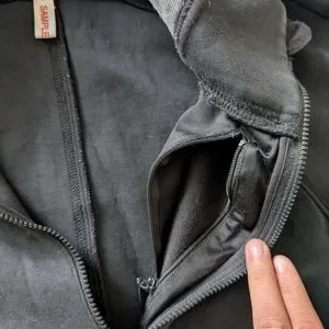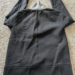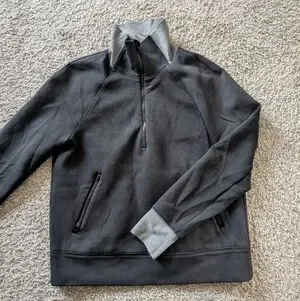Really cute black and grey half zip with double pockets, high collar, and interior zip pocket.
