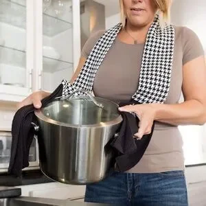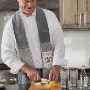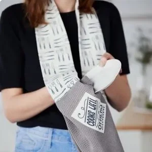 It acts as a stylish, always-accessible accessory for wiping hands, cleaning spills, or handling hot items, replacing the need for a towel tucked over the shoulder.