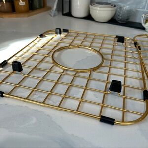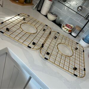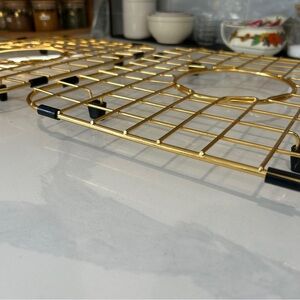 Set of 2 gold tone over stainless steel sink grids.
