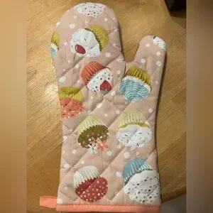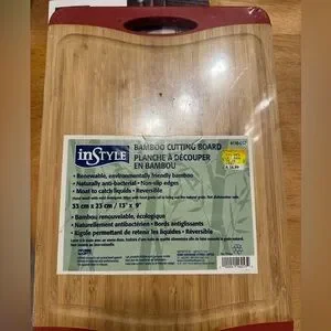 Eco-friendly bamboo cutting board. Features non-slip edges and reversible design. Ideal for kitchen use. Refer to photos cutting board, one oven glove and one mat.