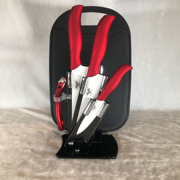 3 ceramic knives & peeler , acrylic stand , cutting board