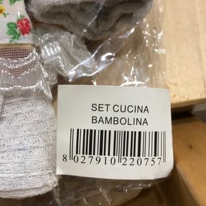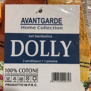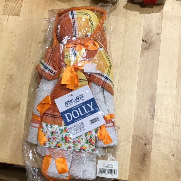 Brand new Kitchen set Dolly bambolina, packed for gift. In the packet, there are 3 dishes towels and one pot holder, all 100 per cent cotton.