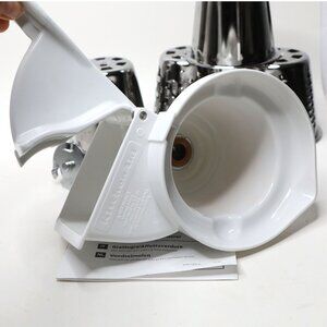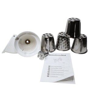 This attachment performs the cutting and shredding duties your food processor might: select the proper cone, slip it into the plastic housing, and attach all to your stand mixer's hub with a metal shaft. You can shred potatoes, onions, nuts, and chocolate, or slice vegetables for cooking or munching. While it adds versatility to your mixer, the unit is cumbersome to disassemble--more so than KitchenAid's other nifty attachments--and its several parts make it difficult to store. Still, it's easier on your arms than manual slicing and shredding, especially for large quantities, and all parts are dishwasher-safe.