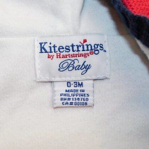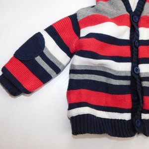 This Kitestrings by Hartstrings Baby 0-3 Months Striped Knit Hooded Lined Cardigan Sweater in Red, White, Gray and Navy Blue is in Excellent clean bright condition. Sweater Outter is 100% Cotton - Lining is 60% Cotton / 40% Polyester - Machine washable. Features soft comfy lining throughout and knit patches on elbows.