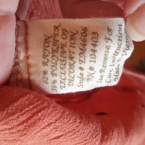 Size M top is a pretty peach colour with black cat heads, ruffled cap sleeves and tie at neckline. By E.M., rayon polyester blend. 22" shoulder to hem and 17" armpit to armpit approximately.