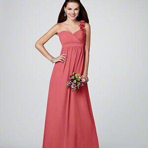 Beautiful flowy 1-shoulder Bridesmaid, formal, cruise, short prom dress by Alfred Angelo. It is beautifully tailored with an elegant light sweetheart neckline and gorgeous quality fabric with a comfy flowy skirt and beautiful floral accent.This gown is absolutely stunning. Very elegant! :) And SO LIGHT! And I LOVE the feel of this fabric! Please see size chart for measurements.