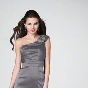 Beautiful Slinky Fitted 1-shoulder Bridesmaid, formal, cruise, short prom dress by Alfred Angelo. It is beautifully tailored with an elegant neckline and gorgeous quality fabric with super fitted bodice and fitted. The ruffle is so Haute Couture! This gown is absolutely stunning. Very elegant! :) And SO LIGHT! And I LOVE the feel of this fabric! Please see size chart for measurements.