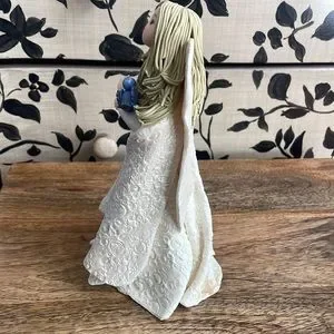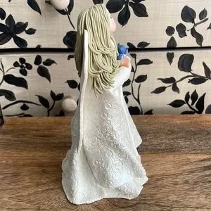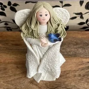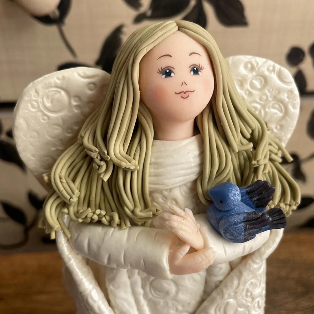 Blonde Kneeded Angel , holding a blue bird stands 8” tall .