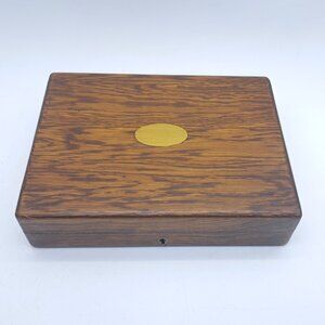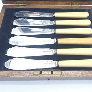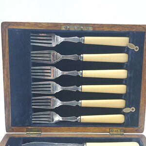A 12 piece silver plated cutlery set of knives and forks in their original wooden box. They were made between 1905 and 1940 by Frederick Asman and Co. in England. The pieces have resin (I believe bakelite) handles; the knives are curved and have a leafy type of decoration going from the base to the tip. The forks have a shield just below their tines and the box is felt lined.