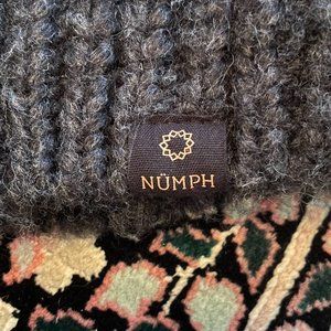 Dark grey knit beanie with faux fur tan colored pom by Danish designer Numph. This cute hat is in brand new condition!