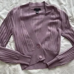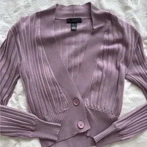 Elevate your wardrobe with this purple knit cardigan in size medium. Designed with a flattering, close-to-the-body fit, it features a two-button closure and hits at the waist. Perfect for adding a pop of color and warmth to any outfit.