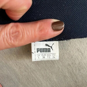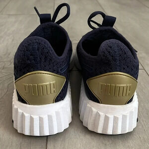 Worn once but too small for me. These comfy knit sneakers are easy to slide on with stretch knit fabric and gold accents. Stylish in navy with white sole and gold logo and back embossed logo. Size 7.5 in excellent condition.